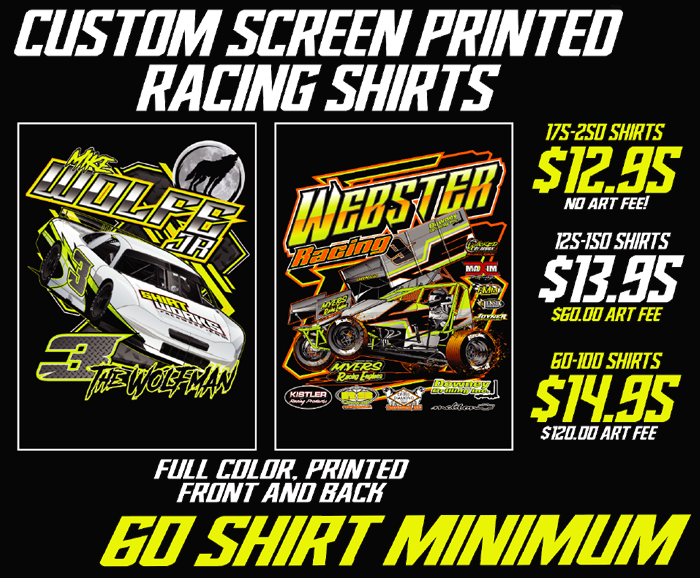 For custom dirt track and asphalt race shirts, we offer designs created using car illustrations from our extensive library. We customize them with your car’s colors, number, sponsor logos, and graphics to make the design uniquely yours. Additionally, screen printing prices are based on quantity, so the more shirts you order, the lower your cost per shirt and design becomes